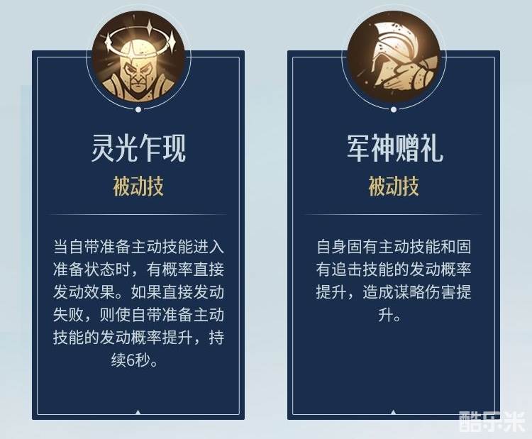 被动:自身固有主动技能和固有追击技能的发动概率提升,造成谋略伤害提升。