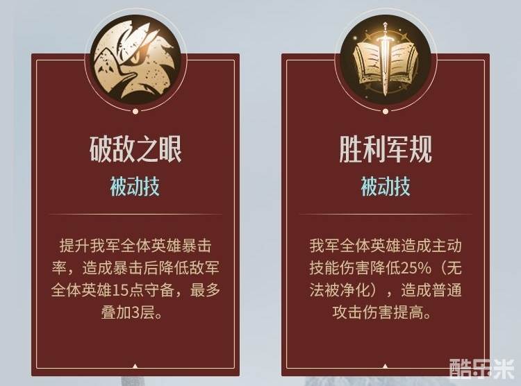 被动:提升我军全体英雄暴击率,造成暴击后降低敌军全体英雄15点守备,最多叠加3层。