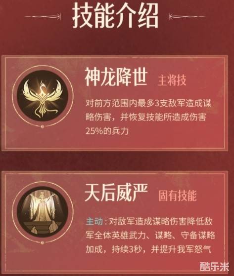 评价:全队辅助女帝,依赖主将技进行输出,多队野战可以一次性消灭大量部队。因为组队战斗中不会释放主将级,不适合参与组队战斗。