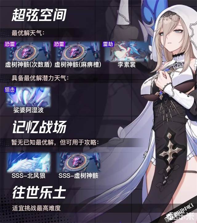 阿波尼亚在应对雷伤的双虚树神骸和新麻痹天气的李素裳都有较大的优势,无论是麻痹,还是次数盾,阿波尼亚和其辅助都有多种方式去应对。在红莲及以下环境,其余的雷伤天也能打出一个不错的分数。在远程阿湿波的攻略中,也会比次生银翼略强,但是中低阶差距并不明显。