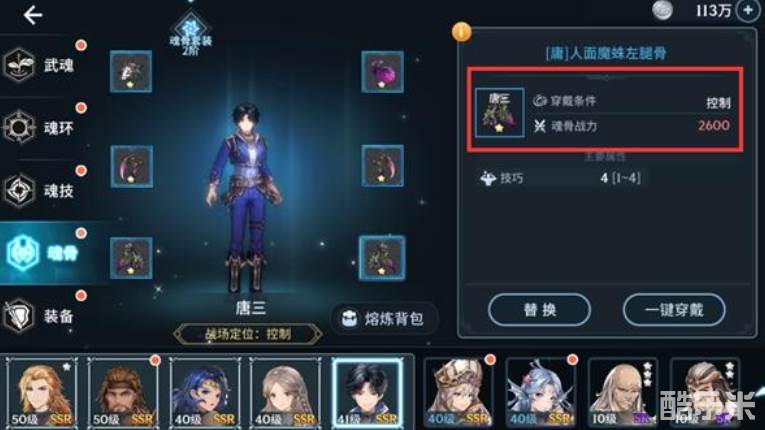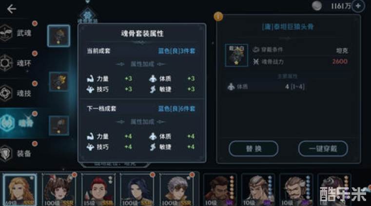 当玩家获取到自己合适的魂骨后,点击魂骨界面,在界面右边会有一件穿戴的选项,就可以将魂骨添。遇到更好的魂骨时得更换,需要点击卸下选项,就可以安装新魂骨,卸下的魂骨来进行融合。当拥有两件不同的魂骨不知如何选时,在魂骨下方会出现当前的各种属性数值,玩家需要根据自己的需求来对比更需要哪一件,最终确定安装的目标。