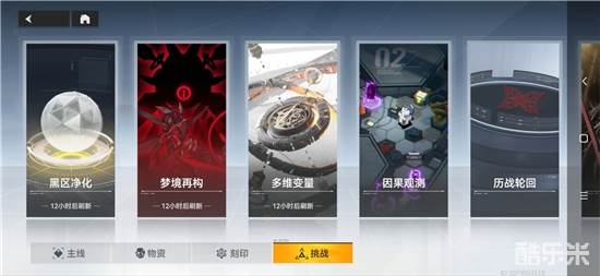 挑战区共有六个部分,分别为“黑区净化”“梦境再构”“多维变量”“因果观测”“历战轮回”“教学训练”。