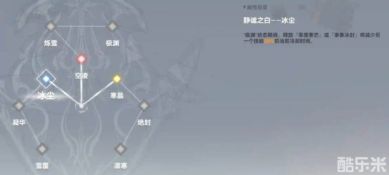 【冰尘】临渊期间,释放【零度寒芒】或【事象冰封】,将减少另一个技能50%的cd。加快了临渊期间的技能释放频率(可以多吃专属buff),变相提高了伤害。