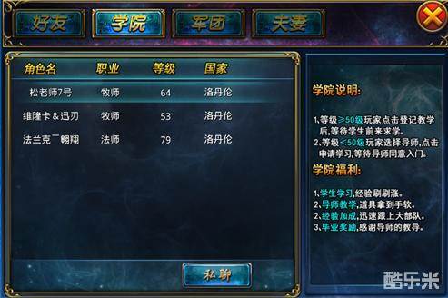 2.等级小于50级的玩家可以在学院界面选择导师,点击申请学习,等待导师同意入门。
