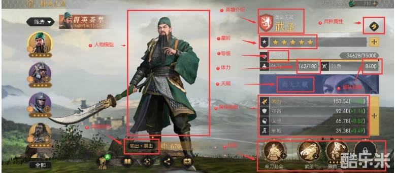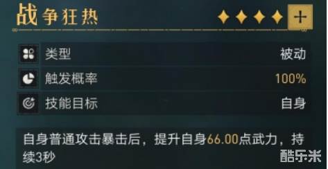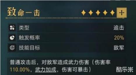 这里我们依旧拿武圣来举例。武圣的定位是输出、暴击。那么就可以为其搭配致命一击、战争狂热这两个技能。致命一击可以增加武力伤害,同时可以造成暴击。而战争狂热,则是能够让武圣在暴击后,提升3秒的武力伤害。