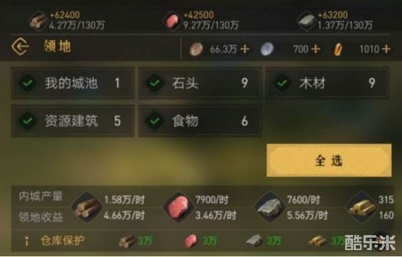 当下这三种资源最主要的来源渠道是领地生产和采集,主城内的固定资源暂且不论。