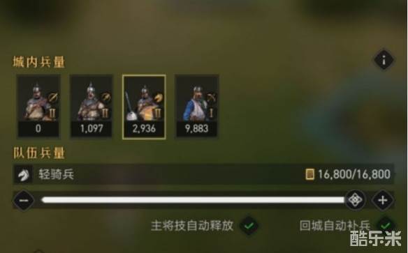 例:9级主城,你想打5级的资源领地,一般需要两队20级左右的将领(每队2人,可以一个队伍骑兵一个队伍剑士等等,分兵种携带),也就是说你使用的这两个兵种,单兵数量需要在16000以上,保持这个数值就足够你打5级资源了。