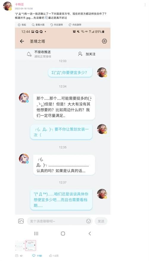 紧接着,这位内鬼又私自以官方身份去私信UP谈打折合作,不料却被官方和UP主双双晒截图曝光社死,并由此引发了一场玩家对于“史上最惨甲方”、“从未见过如此卑微的甲方爸爸”等一系列话题的讨论,成功将“穷官方”的形象扩散。