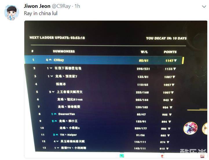 Ray刚刚打到中国峡谷之巅的首位。(兴奋脸)