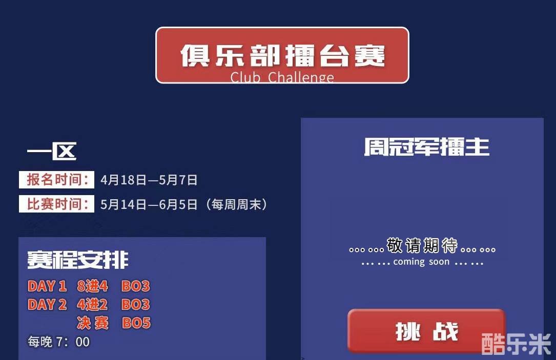 最先开启的是一区的比赛(其他打球晚点将会),报名截止时间到5月7日,比赛时间为5月14日到6月5人,每周周末进行比赛,比赛将采用BO3赛制,决赛采用BO5赛制,每天晚上7点开始比赛。