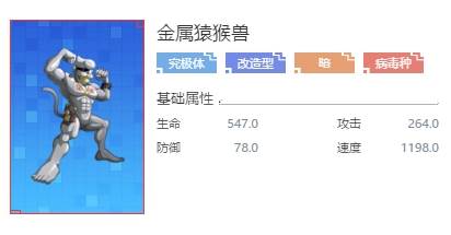 攻击拥有异常状态的目标时,有25%*其异常状态数量的概率使目标的进化或超频效果解除;被拥有异常状态的目标攻击时,金居猿猴兽降低自身受到的伤害,降低的值为金属猿猴兽攻击力的50%