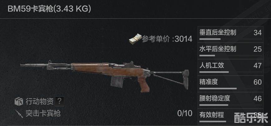BM59同样是一款入门级的突击卡.宾.枪,比起前面两款卡.宾.枪,它使用的弹药是威力更大7.62x51毫米子弹。使用88基础伤害的UN弹攻击2级甲以下的目标时,击中胸口就可一击制敌,在赛季初期是比较好用的。不过其除了换大弹匣和加装瞄具之外无法做进一步改装,因此出场率远不如Hunter。