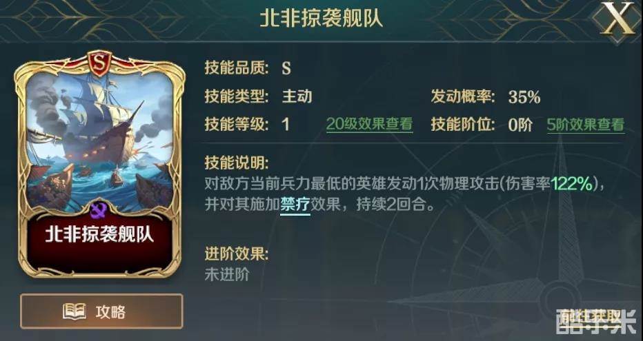 【北非掠袭舰队】能使关羽对敌方兵力最低的英雄发动1次伤害率上限488%的物理攻击,并对其施加禁疗效果,持续2回合。