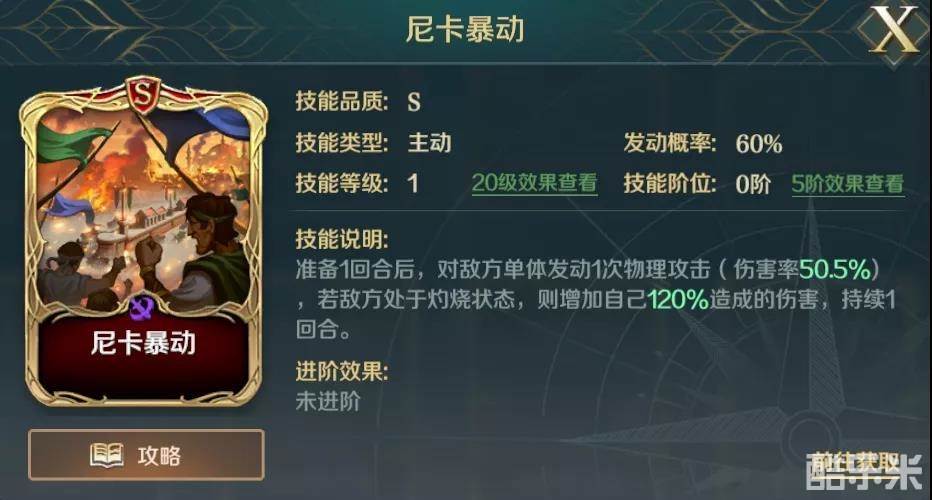 【尼卡暴动】则是与【关圣帝君】相似的灼烧机制,准备1回合后,对敌方单体发动1次伤害率上限为404%的物理攻击,若对方处于灼烧状态下,则增加自己120%造成的伤害,持续1回合。