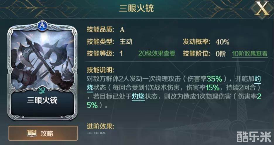 【三眼火铳】能够对敌方造成两次物理伤害,并施加灼烧效果,如果目标已经处于灼烧状态,那么会改为一次物理伤害。