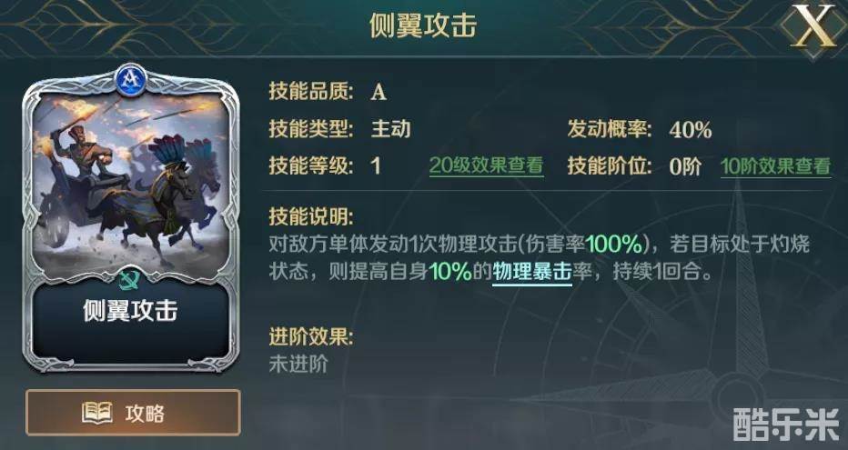 【侧翼攻击】能对目标发动一次物理攻击,若目标处于灼烧状态,那么提升自己10%的物理暴击率。