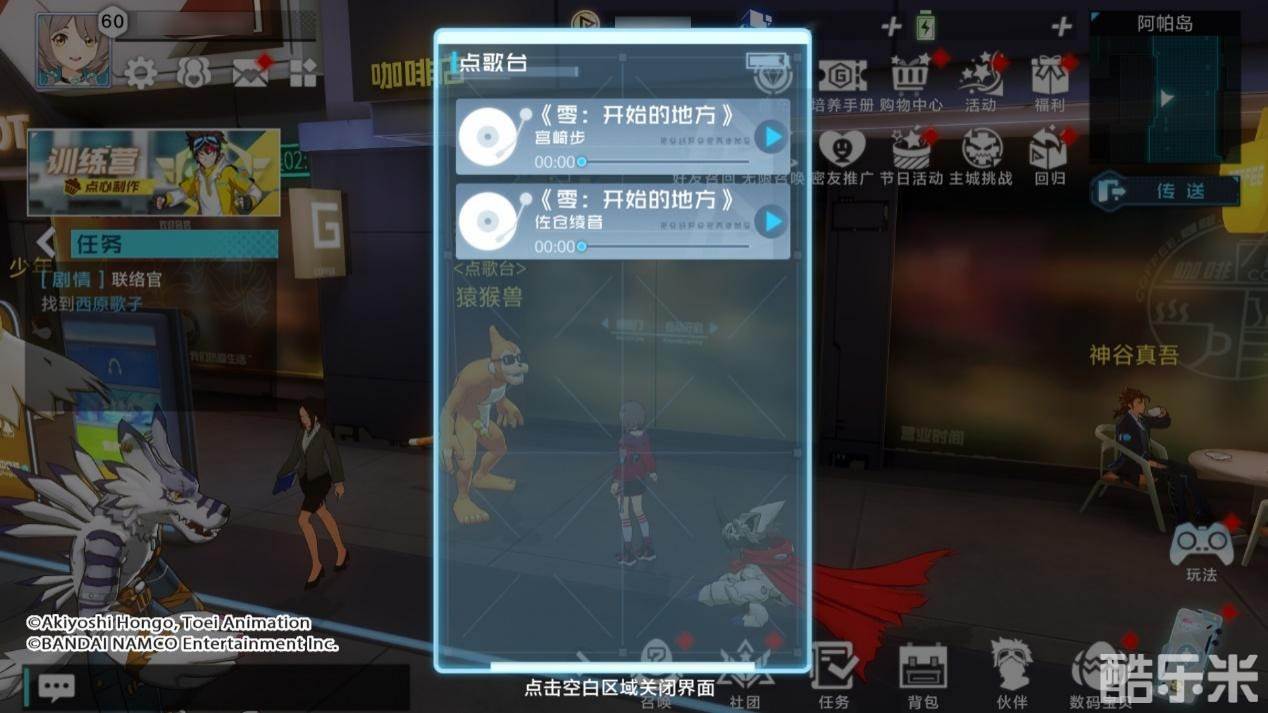 我们前往阿帕岛,与NPC猿猴兽交互后,它会欢迎你来使用这个全新的功能——点歌台,随机跳出点歌台的选项,在选择列表中我们能够选择音乐,诸如数码宝贝新世纪的主题曲《零:开始的地方》,在本作的主角们也会倾情献唱。