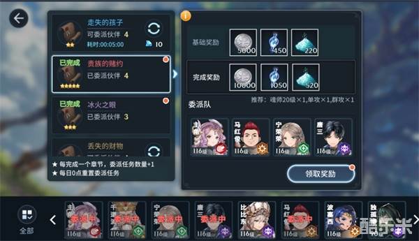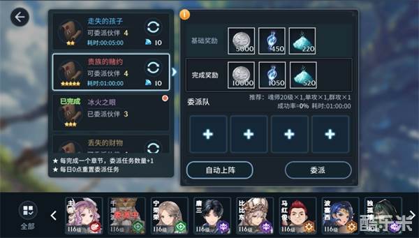 按照推荐阵容派遣可以获得更高的成功率。不同品质的事件奖励不同,成功完成任务,奖励将会翻倍