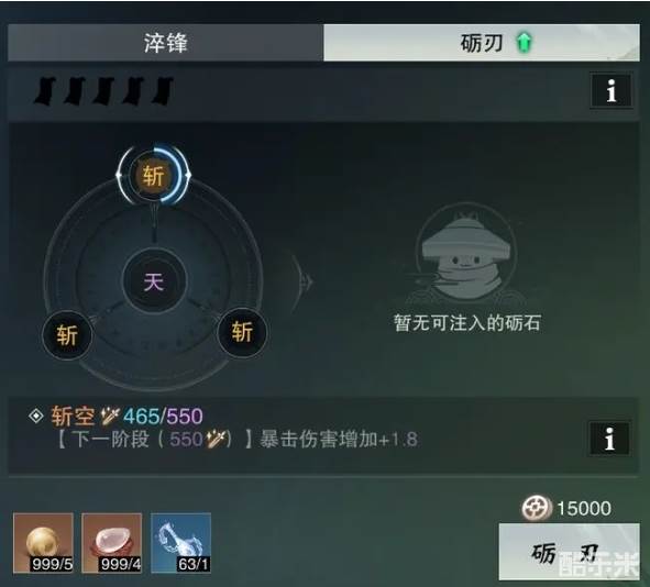 在砺刃玩法中,普通节点可以使用砺石进行强化。点击“砺刃”按钮,会跳出不同种类的砺石供少侠选择,成功后可以提高锋利度,失败后则会降低锋利度。
