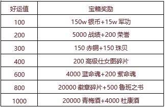 【活动内容】活动期间,每消费1000金币,即可获得100好运值,累计获得好运值可开启奖励宝箱。