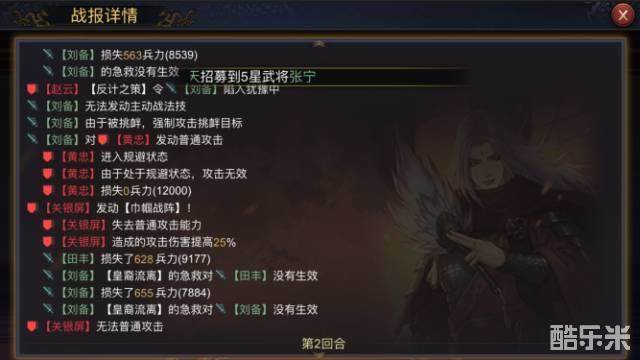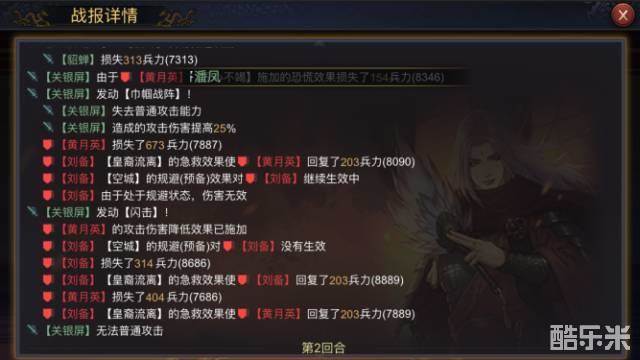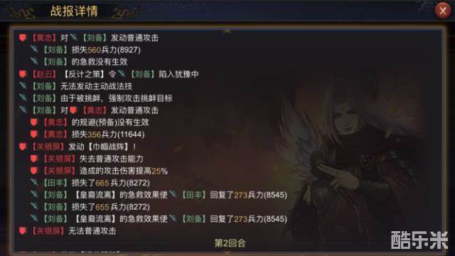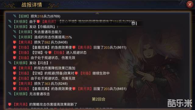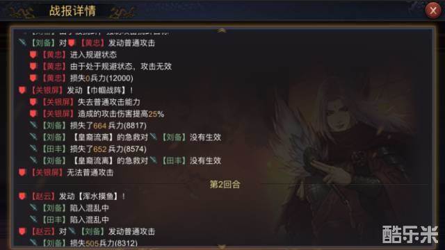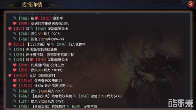同样选取演武中的黄忠(伤害率低于100)和关银屏(伤害率高于100)作为比对对象,己方武将田丰在依次增加10、10、20、20四次防御的情况下,受到黄忠的伤害分别为:484、471、468、446、441,受到关银屏的伤害分别为:665、664、628、590、555。对比刘备在防御未变化的情况下,伤害基本稳定。