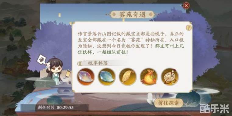 1、雾苑奇遇是在景域寻宝玩法中有几率触发的副本,由于副本的难度较高,建议玩家们组队3人进行挑战,如果单人挑战的话只能够携带2个角色;玩家也可以点击世界频道其他玩法发布的招募信息进入队伍,参与挑战;