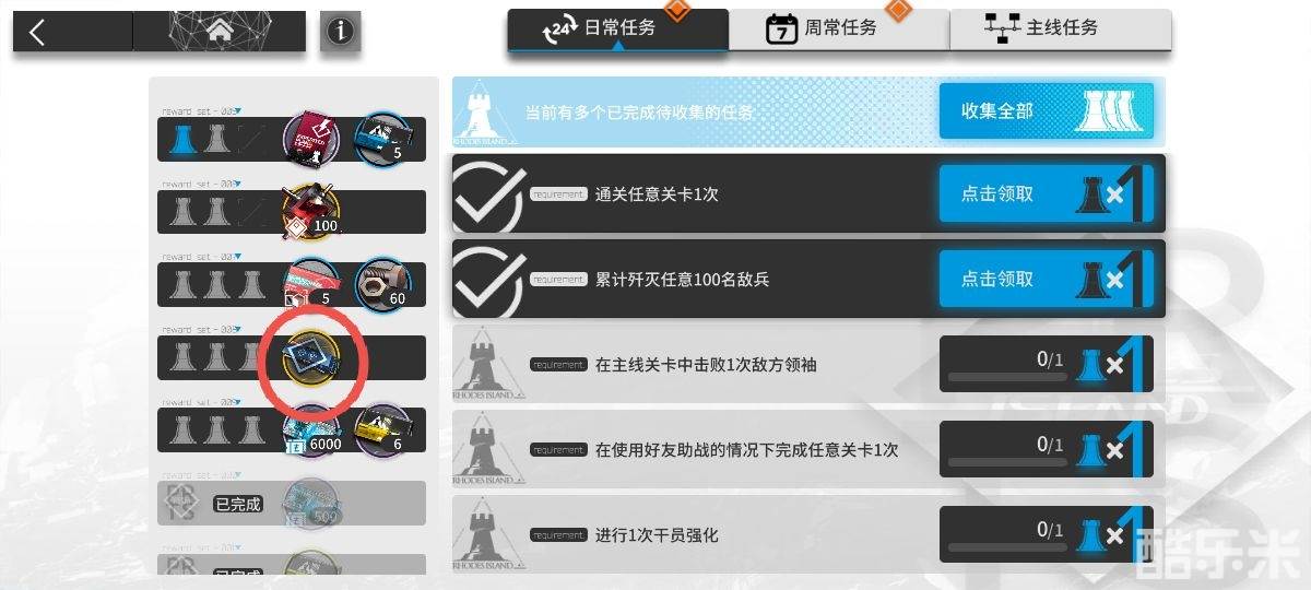 扫荡券在每日任务里获得。小伙伴们可以像往常一样做完每日任务,就可以领取扫荡券了,扫荡券如下图红圈中所示: