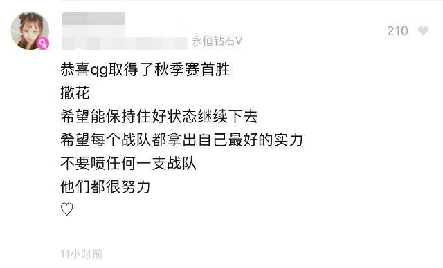 这位昵称为“抱抱柒柒吧“的网友评论道:“恭喜QG取得了秋季赛首胜,希望能保持住好的状态继续下去,希望每个战队都拿出自己最好的实力,不要喷任何一支战队,他们都很努力。”