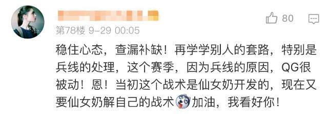 这位微博昵称为“易烊千玺的大鼻孔“的网友评论道:”稳住心态,查漏补缺!再学学别人的套路,特别是兵线处理,这个赛季因为兵线的原因QG很被动,当初这个战术是Gemini开发的,现在又是要Gemini解自己的战术,加油!”
