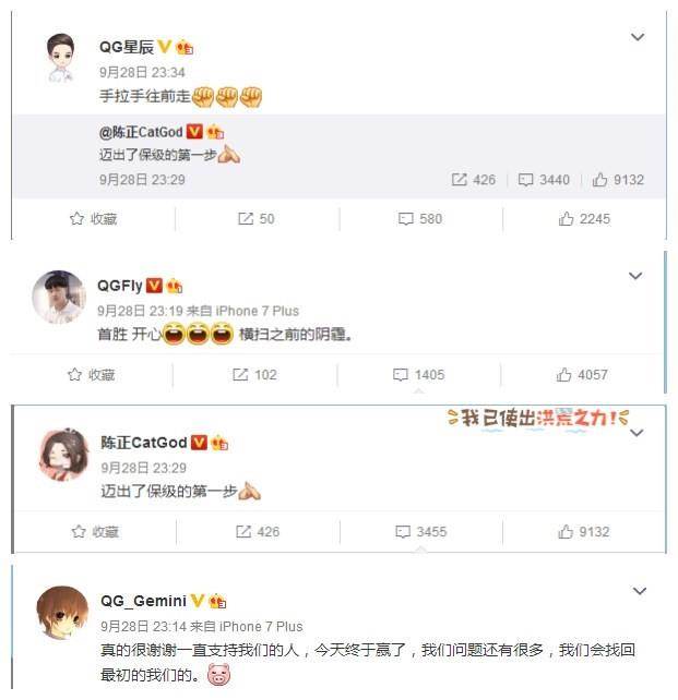 赛后QG众人一扫首周战败内心的那一抹阴霾,纷纷发微博与粉丝分享胜利的喜悦。看到状态回归的QGhappy,小编心中也是扬抑着一种内心无法言语的喜悦。
