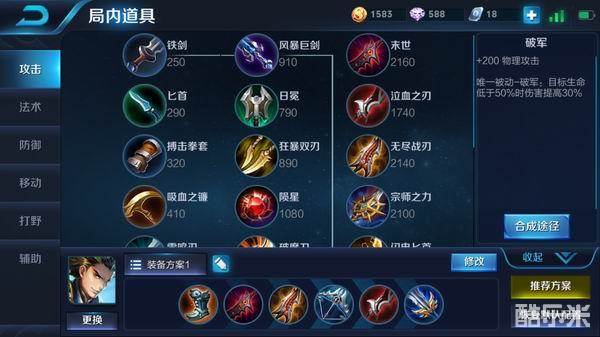 解析:泣血之刃提高了狄仁杰续航能力以及生存率,打完团战没血的时候可以清野或清兵回血,然后马上重返战场。破军使狄仁杰输出最大化,并且可以快速收割敌方残血英雄。