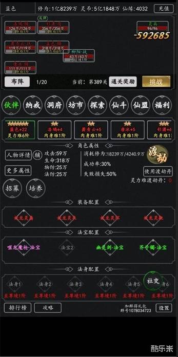 其次升级灵根和灵阵师,最后升级战阵,不过战阵最好还是跟着平均等级走。先手3号位首发技能的前提好像就是9级战阵(等级越高你法身的等级需求就可以降低)。最重要的一点,9级战阵能在你推图的时候,只要你剩了4个角色,就是一回合一轮技能。12级战阵应该是剩3个角色可以做到一回合一轮技能。