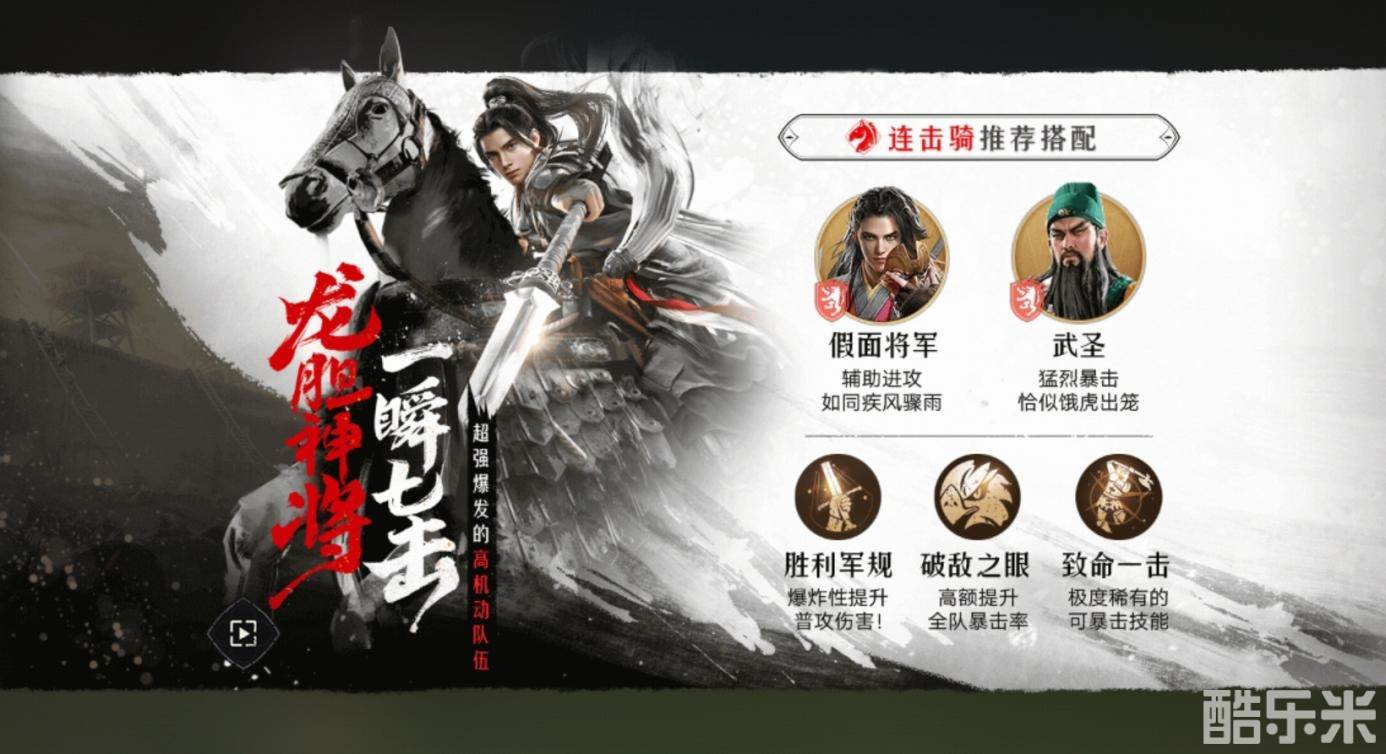 我们都知道,仅仅拿到几个英雄是不够的,我们还要对他进行培养,配技能、升阶等等。而勇武骑进阶后的队伍就是连击骑,该阵容的关键英雄兰陵王,可以在赛季进行到冲锋陷阵、英雄反攻时的东洲龙影卡池招募。