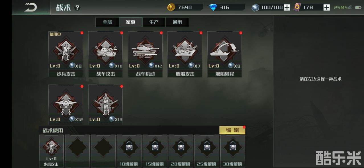 军事类战术总的来说就是提升战斗能力,其中“步兵攻击”、“战车攻击”、“舰船攻击”、“空军攻击”和“全军攻击”这五种战术直接提升单位的伤害。而“战车机动”提升战车移动速度,“舰船射程”增加舰船攻击范围。