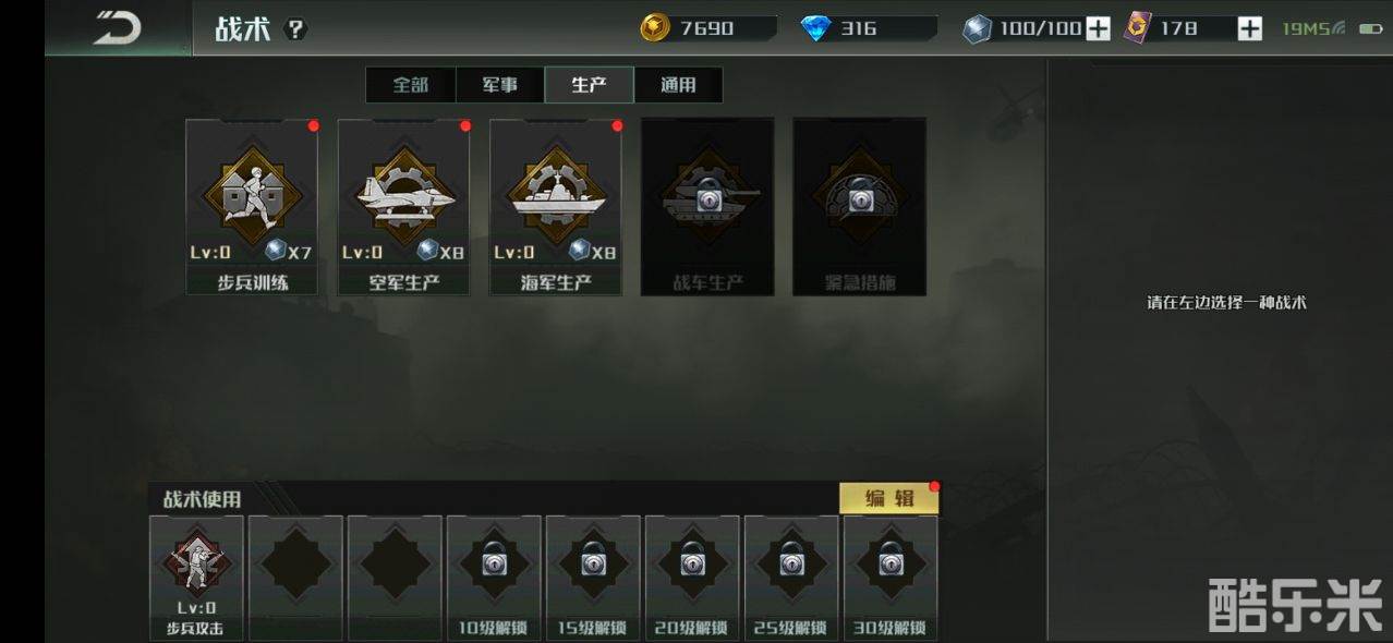 “步兵训练”和三种兵种生产战术提高兵种的训练速度,“紧急措施”战术提供建筑方面的加成,在资源不足时有奇效。