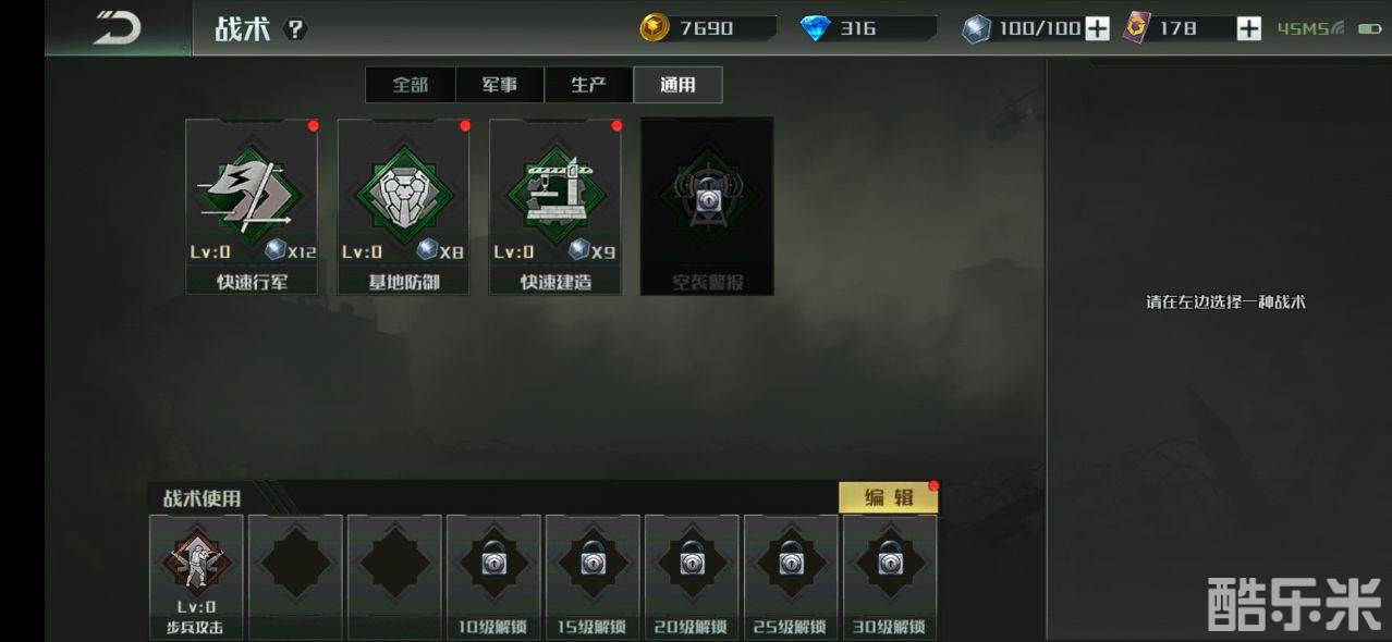 通用类战术是策略性比较强的一类,其中“快速行军”短时间内提升所有单位的移动速度,“基地防御”增加建筑护甲,“快速建造”提升建筑建造及升级速度。“空袭警报”则是通过加强防空建筑与单位,并减少敌方飞机伤害来提升防空能力。