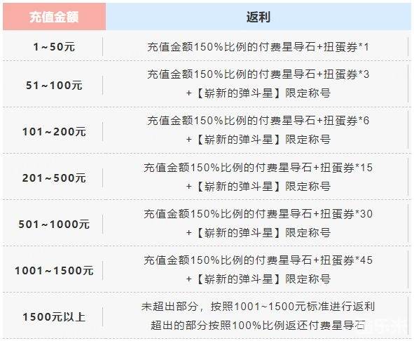 玩家在测试期间充值任意金额,在公测时根据您充值金额所处的档位,可以获得相对应的一份丰厚返利。(每名玩家总计只能在一个档位内获得返利,各个档位返利不叠加),详细返利规则如下: