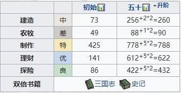 初始属性:建造73,农牧49,制作425,理财141,探险86。