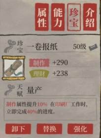 胡月眉装备时制作属性提升10%。在印刷厂工作时,立即完成40%的进度。