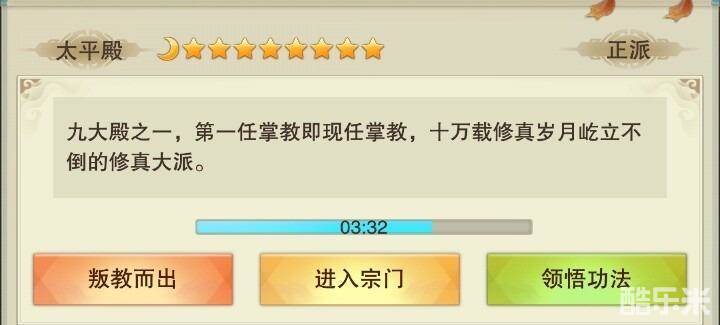 点击“叛教而出”,会根据门派的等级扣除一定的声望,使得玩家重新回到无门派的散修状态,以便再次刷自己想刷的门派。进门派学满攻防以及秘诀后即可叛教而出,从而刷下一家门派,可以说门派只是一个工具,达成目标后即可舍之而去。当自己目前境界能刷到的所有门派全部毕业以后,一般会选择一个有炼丹术的门派挂丹方,以待下一个刷门派的关口。
