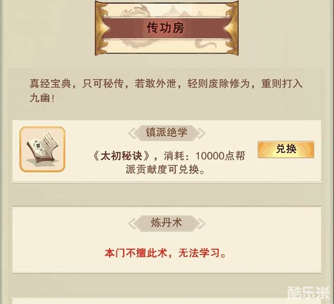 4.传功房传功房内可以查看本门派是否能学习炼丹,炼器,阵法,有无门派秘籍。一般来说有秘籍的门派才值得在内常驻,如果当前门派全部毕业,建议选择有炼丹术的门派挂丹方。