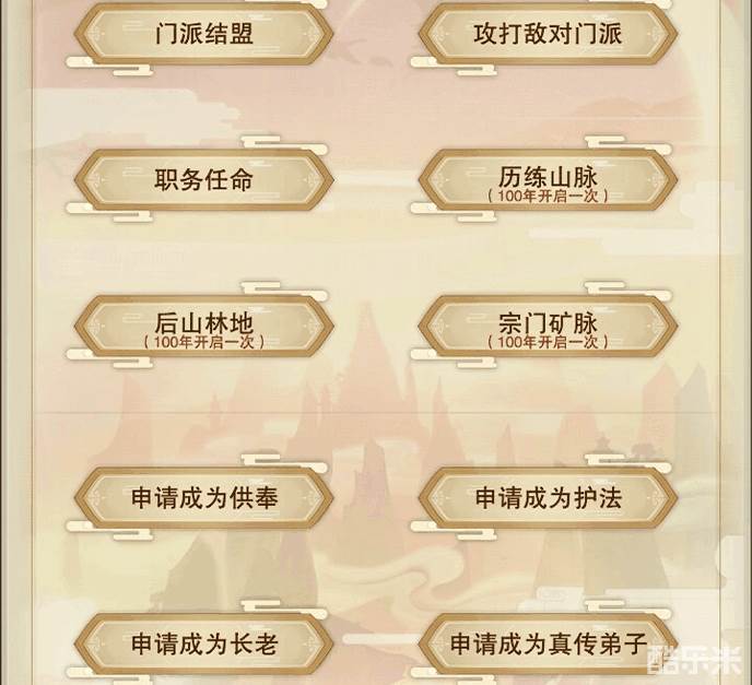 (2)门派职位消耗门派贡献,提升门派职位,门派职位可用于接取更高层的门派任务,部分门派建筑需要真传弟子方可进入。内门弟子100贡献,执法弟子500贡献,真传弟子2000,长老5000,护法1万,供奉5万。