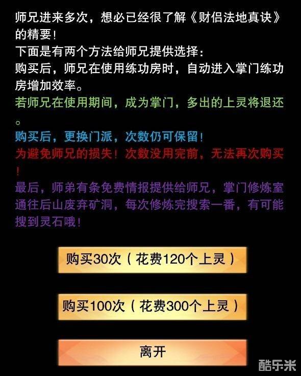 (2)掌门练功房掌门练功房能在基础修炼加成的前提下,额外增加0.5倍的修炼增益,秘籍加成也能享受0.5的增益,秘籍越多,收益越是巨大。