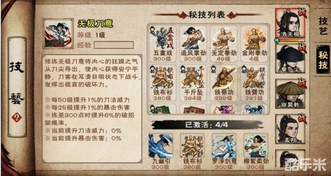 无极刀意能通过打怪升级;每50级提升1%的刀法威力、每25级提升1%的暴击伤、练至300点时提升6%的破招架势概率、满级:6%刀法加12%爆伤加6%破招架、同类型秘技狂狮对比:20臂力架20%爆伤。