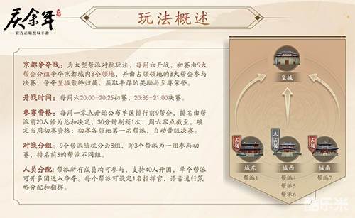 帮派群雄齐聚京都,但需要达到相应的条件才能拥有参赛资格。“京都争夺战”玩法上线后,每周一零点开始,游戏内将公布单区排行前9帮派,排名由帮派前20人修为总和决定,30分钟刷新1次,周六零点截止,确定当周初赛资格。随着上线日期的临近,各帮派可以招募更多高战力玩家,同时成员也需要提升自身实力,共同全力以赴角逐参赛资格。