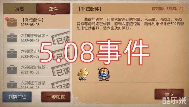 由于大量玩家的集体反馈最终换来了官方的补偿奖励,在母亲节的当天轰轰烈烈的5.08事件终于得以平息,而补偿的奖励是500线索和一个排位珍宝。