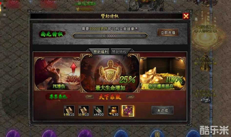 2.打开特权,领取赞助特权,包括英雄豪杰、名震江湖、江湖名宿、称霸武林、天下求败。