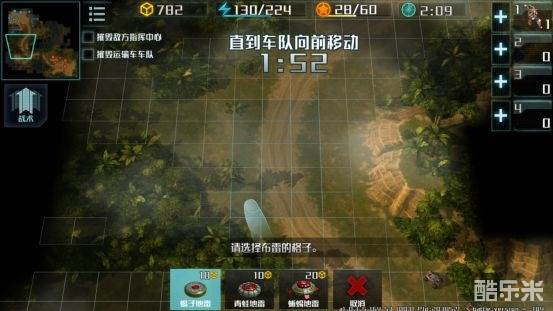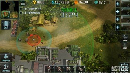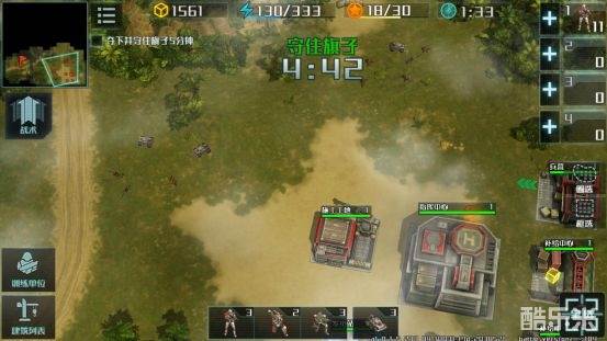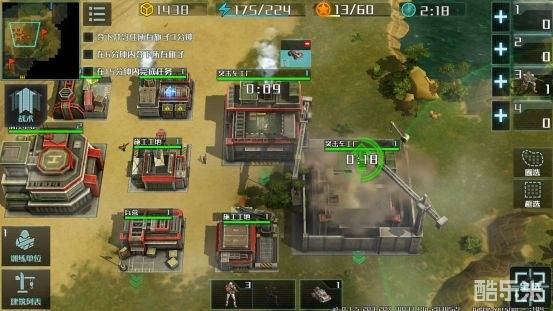 此关开局有三处棋子处需要争夺,利用系统所给兵力进行争夺后,后方建造兵营和突击车工厂,生产大量兵力派往旗子处驻守,待倒计时结束之前全部部队进攻右下角,摧毁敌人建筑群后便可过关,这关消耗时间较长。