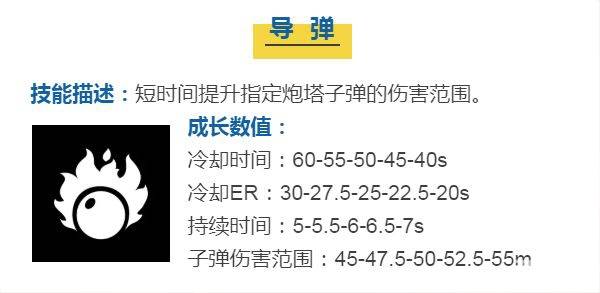这个技能加强的是炮塔射击出的子弹的伤害范围,特别适合应对密集队列的进攻,对他们造成范围性的杀伤。