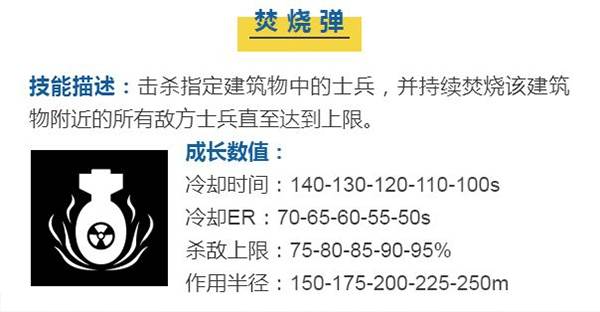 这是一个非常强大的技能,几乎能对敌方造成毁灭性的打击,因为伤害的不是士兵个数而是百分比,这与指定建筑的初始人数息息相关,因此指挥官需要提前预知敌方防御(人数)最强的地方。